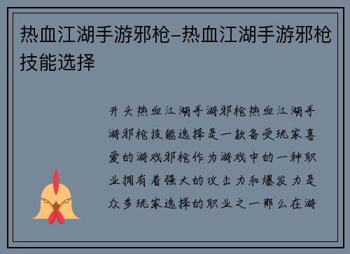 以上就是关于热血江湖手游邪枪-热血江湖手游邪枪技能选择的相关知识介绍。希望对广大玩家有所帮助。在游戏中,我们需要不断学习、探索,才能更好地提升自己的实力。祝愿各位玩家在游戏中取得更好的成绩!