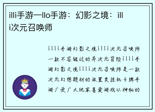 《illi手游:幻影之境:illi次元召唤师》——一款不容错过的异次元冒险 《illi手游:幻影之境:illi次元召唤师》是一款次元幻想题材的放置类挂机卡牌手游,广受广大玩家喜爱。游戏以神秘的幻影之境...